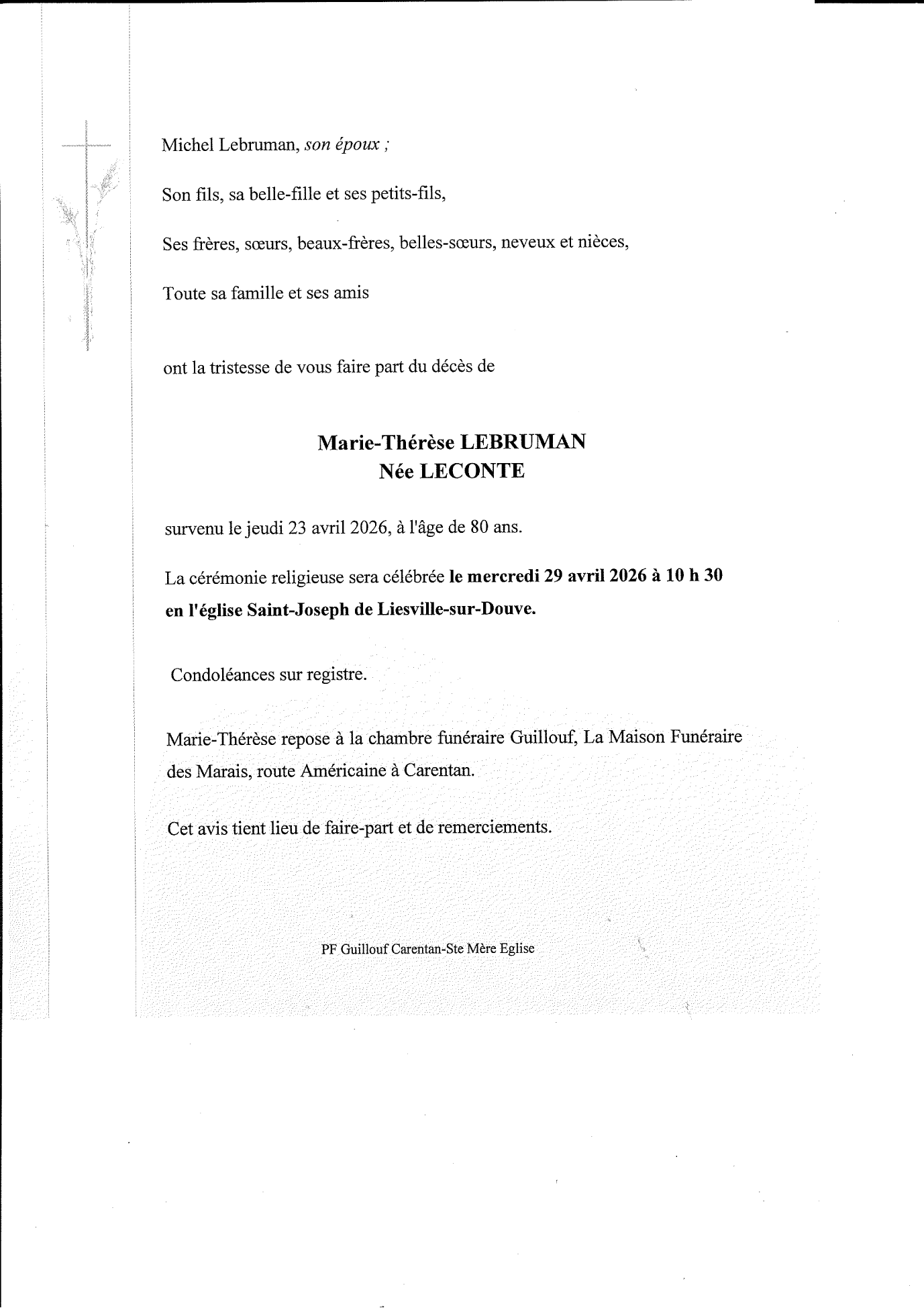 église Saint-Martin de Liesville-sur-Douve le mercredi 29 avril à 10 heures 30