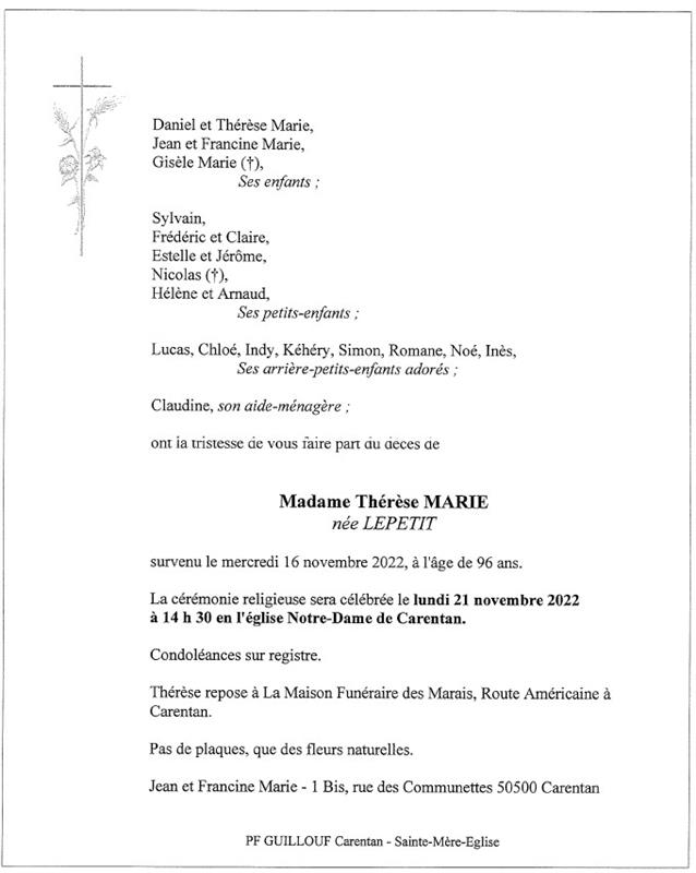 Décédée à Cherbourg-En-Cotentin (50100, France) le mercredi 16 novembre 2022 à l'âge de 96 ans