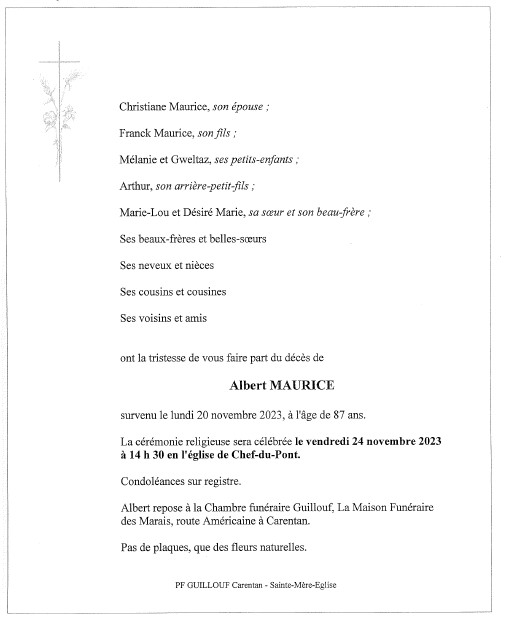 Décédé à Sainte-Mère-Eglise (50480, France) le lundi 20 novembre 2023 à l'âge de 87 ans