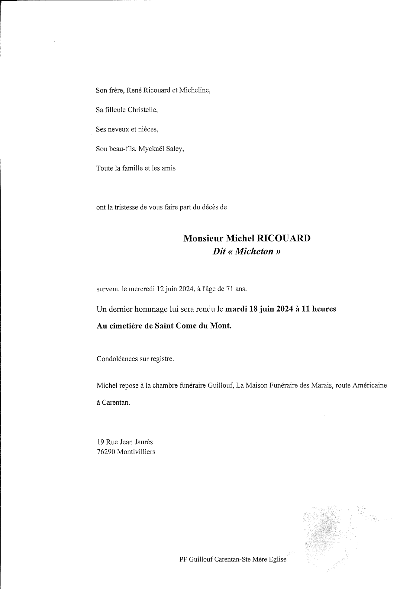 Décédé à Saint Côme du Mont (50500, France) le mercredi 12 juin 2024 à l'âge de 71 ans