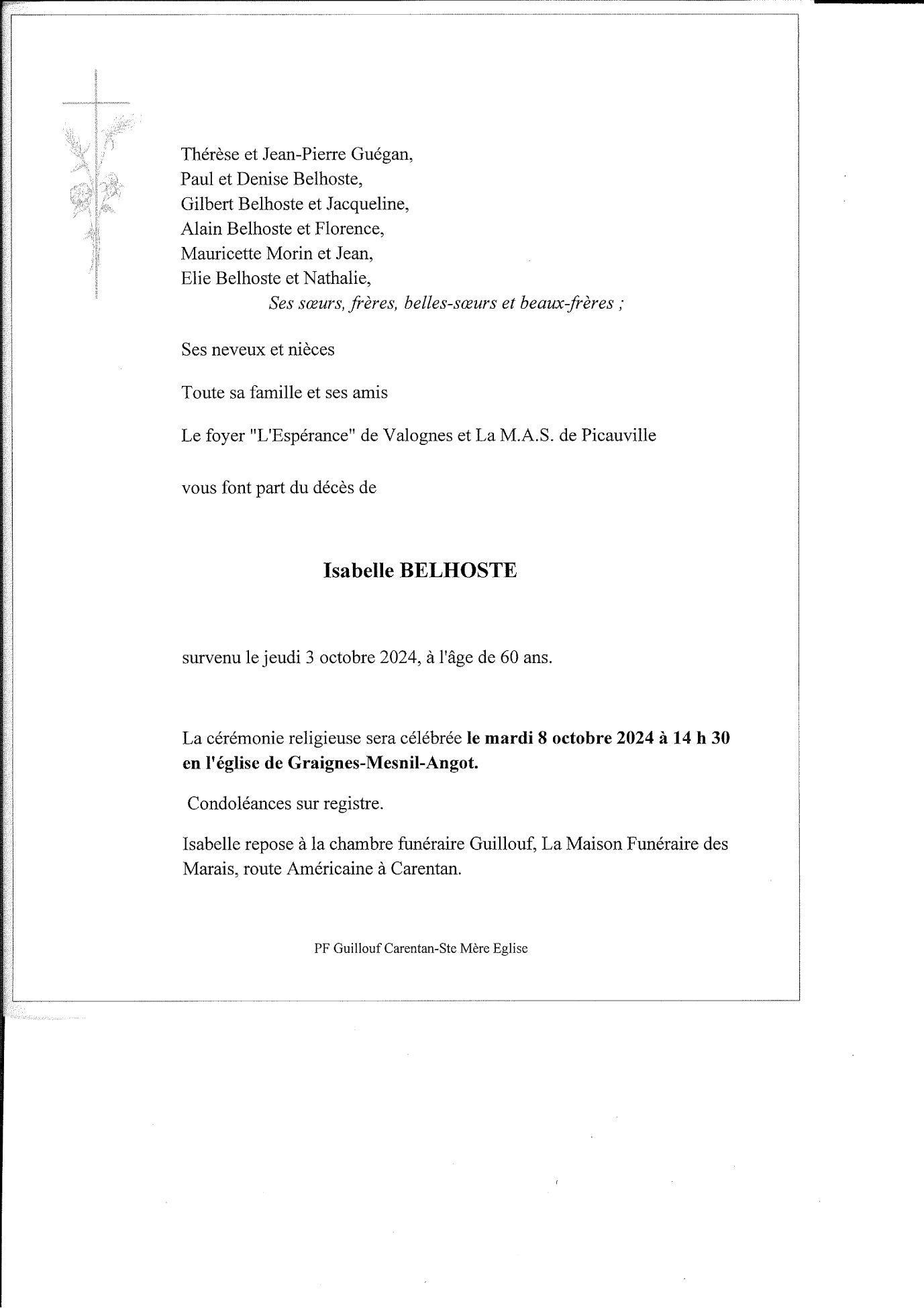 Décédée à Picauville (50360, France) le jeudi 3 octobre 2024 à l'âge de 60 ans