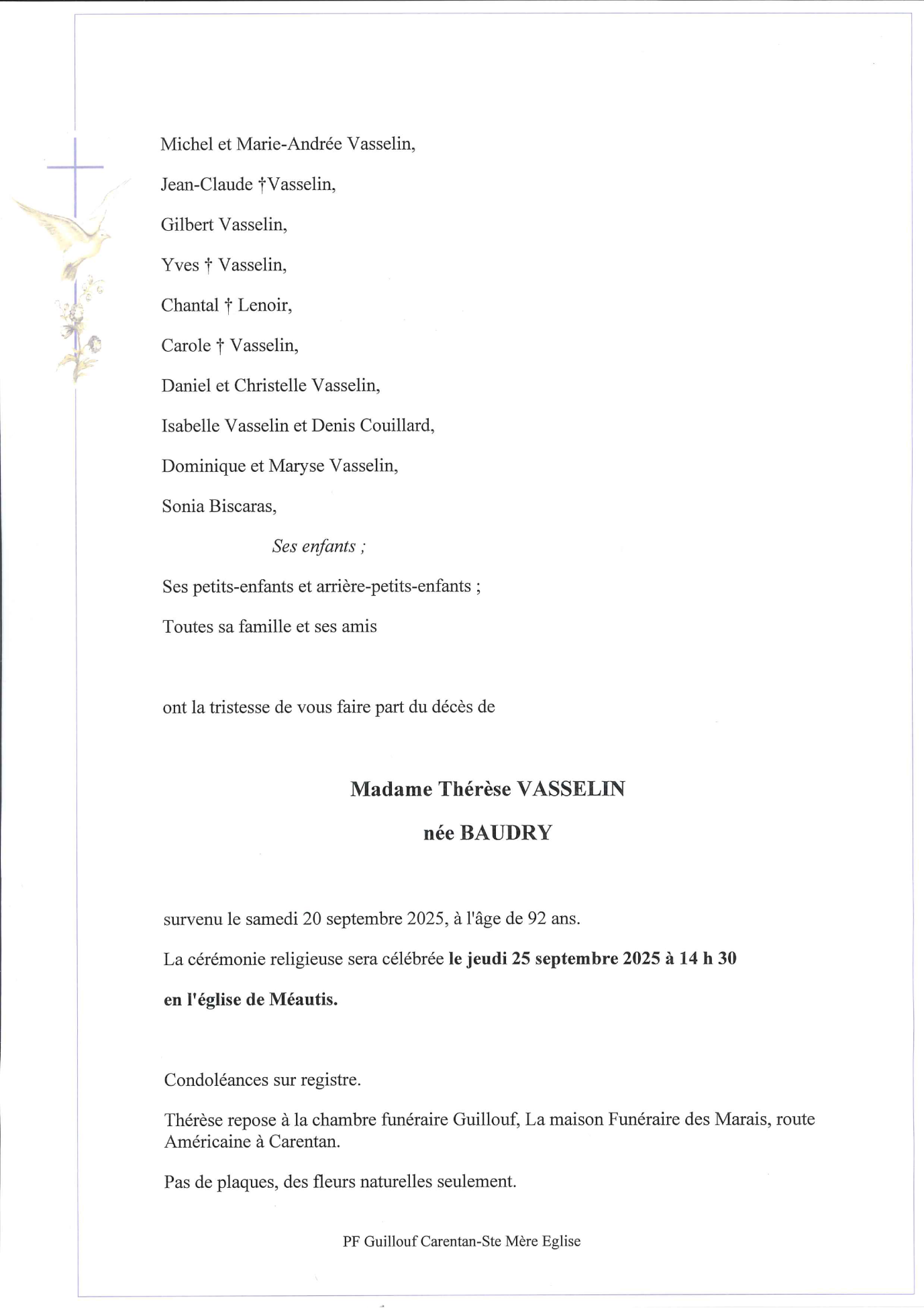 Décédée à Carentan (50500, France) le samedi 20 septembre 2025 à l'âge de 92 ans
