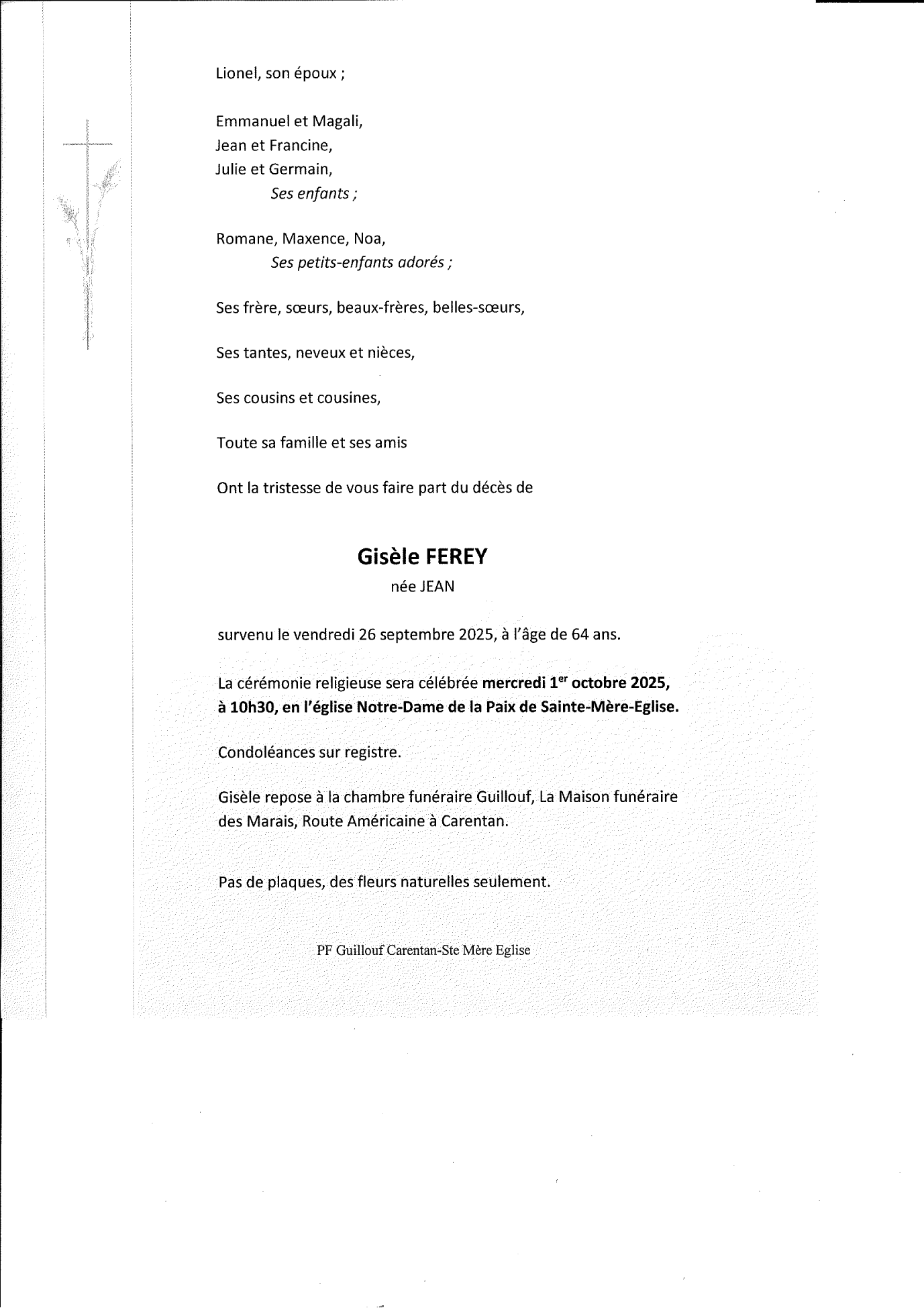 Décédée à Sainte-Mère-Eglise (50480, France) le vendredi 26 septembre 2025 à l'âge de 64 ans