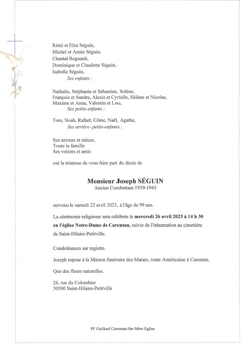 Décédé à Carentan (50500, France) le samedi 22 avril 2023 à l'âge de 99 ans