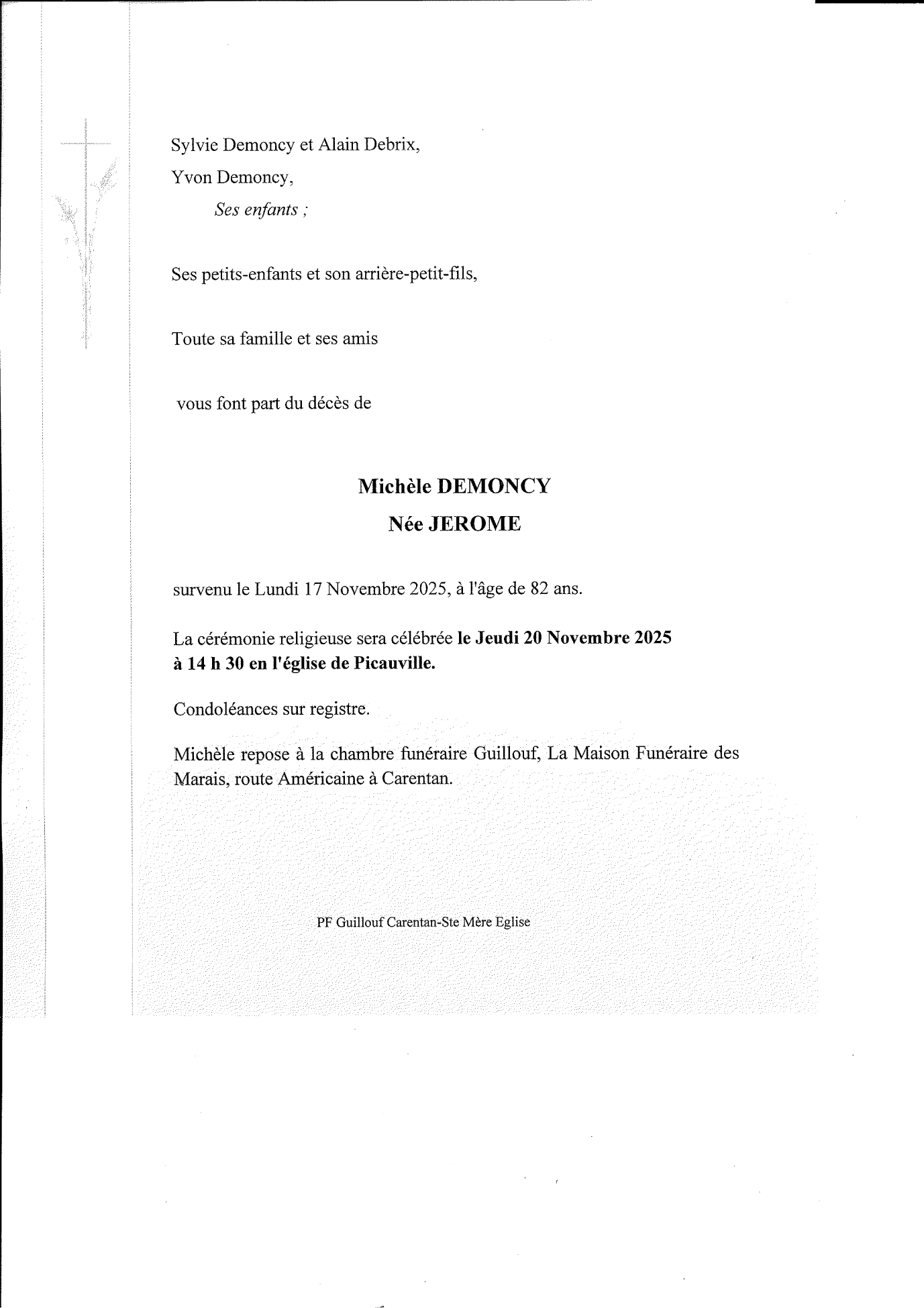 Décédée à Picauville (50360, France) le lundi 17 novembre 2025 à l'âge de 82 ans