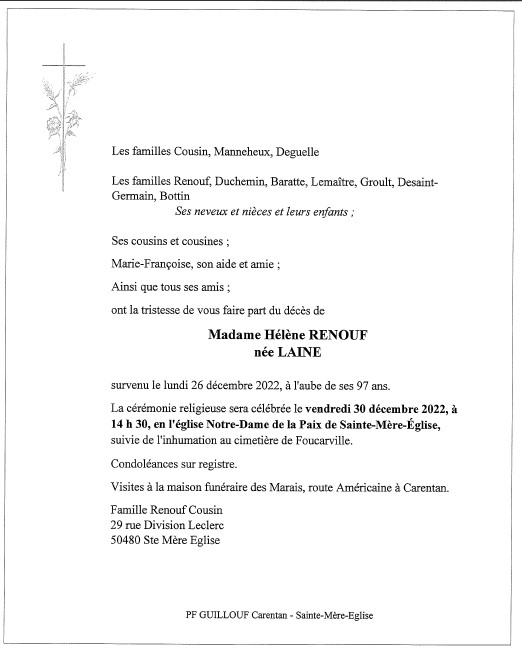 Décédée à Sainte-Mère-Eglise (50480, France) le lundi 26 décembre 2022 à l'âge de 96 ans