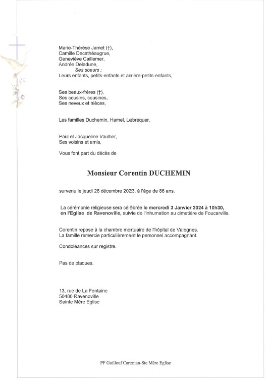 Décédé à Valognes (50700, France) le jeudi 28 décembre 2023 à l'âge de 86 ans