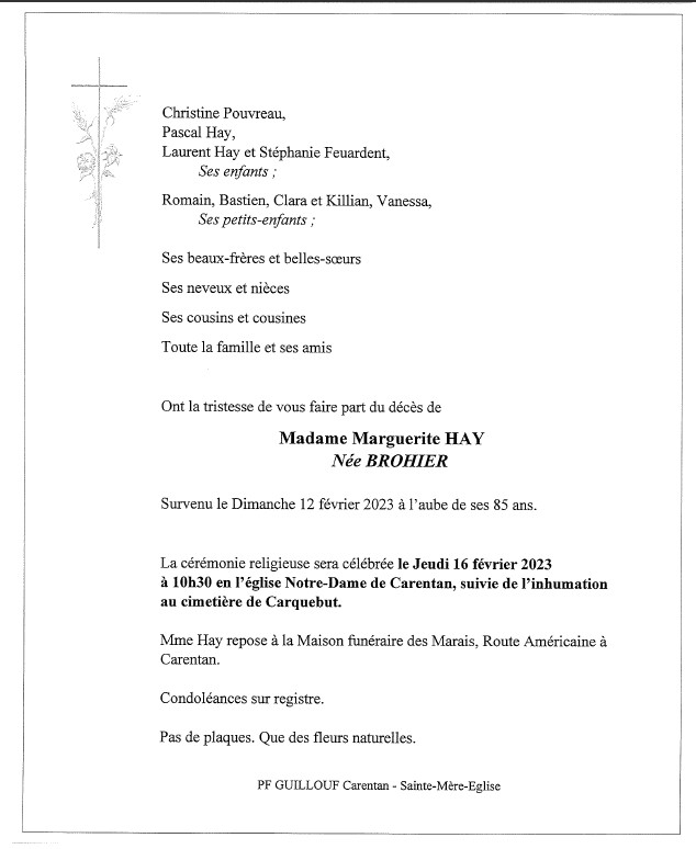 Décédée à Cherbourg-En-Cotentin (50100, France) le dimanche 12 février 2023 à l'âge de 84 ans