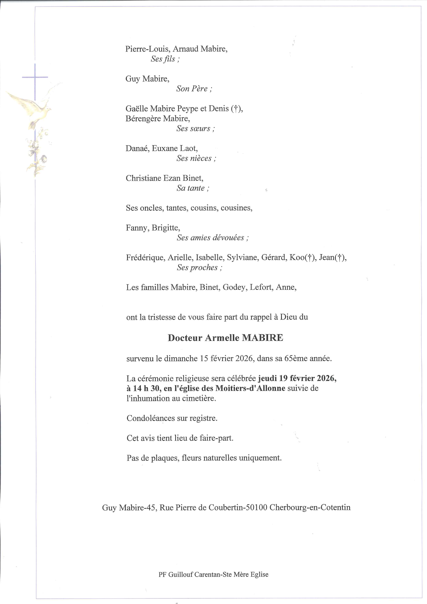 Décédée à Carentan-les-Marais (50480, France) le dimanche 15 février 2026 à l'âge de 64 ans