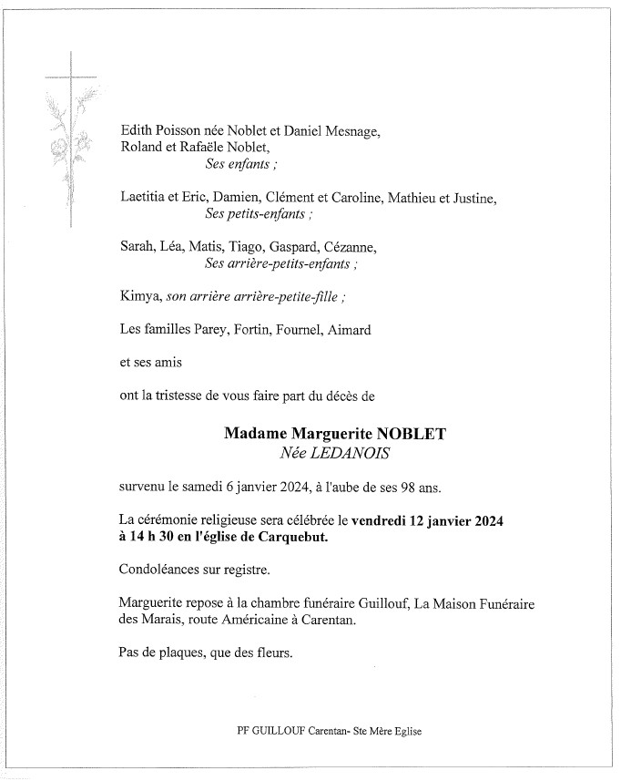Décédée à Saint-Lô (50000, France) le samedi 6 janvier 2024 à l'âge de 97 ans