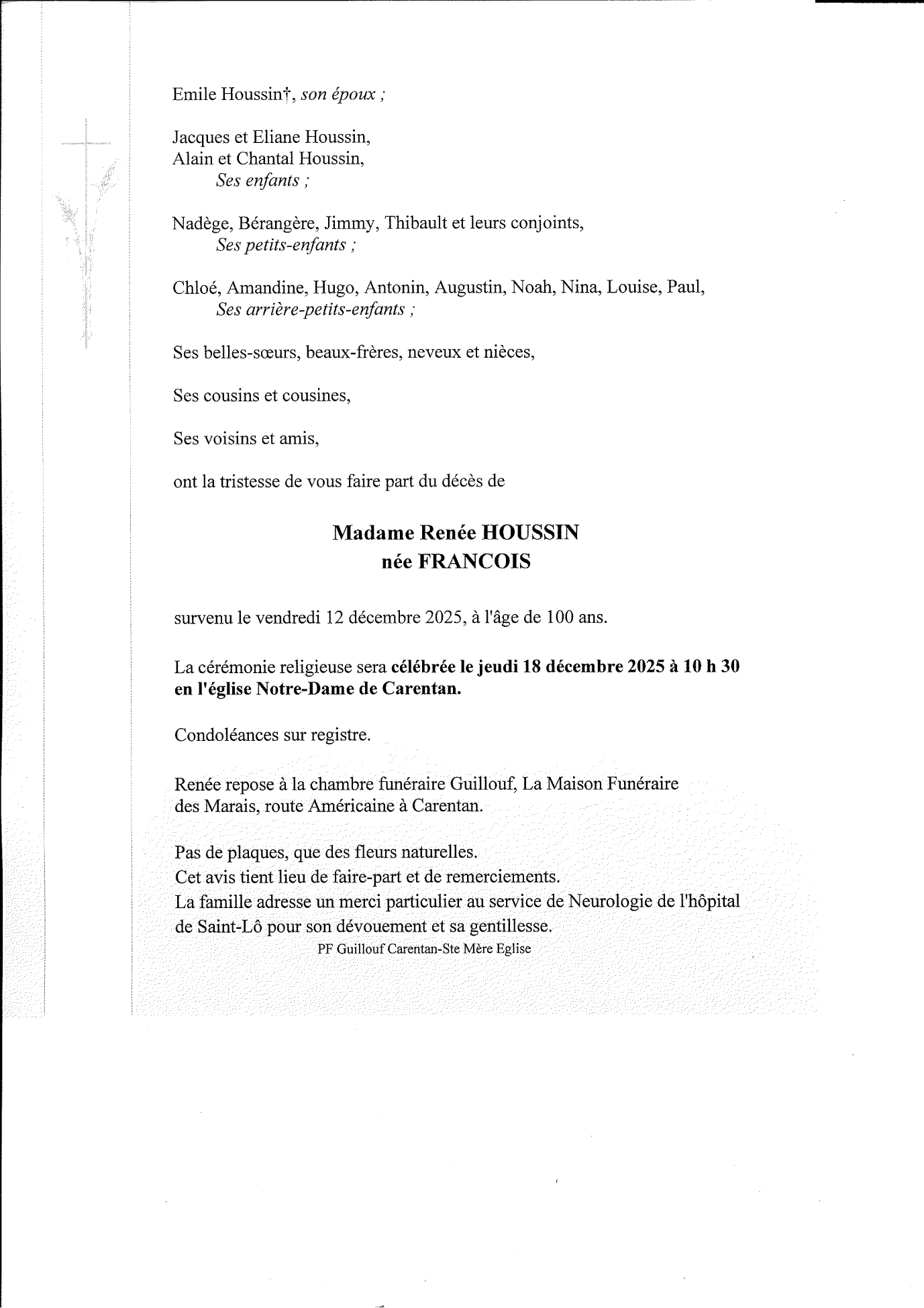 Décédée à Saint-Lô (50000, France) le vendredi 12 décembre 2025 à l'âge de 100 ans