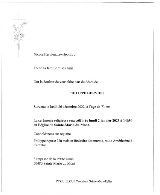 Décédé à Sainte-Marie-du-Mont (50480, France) le lundi 26 décembre 2022 à l'âge de 73 ans