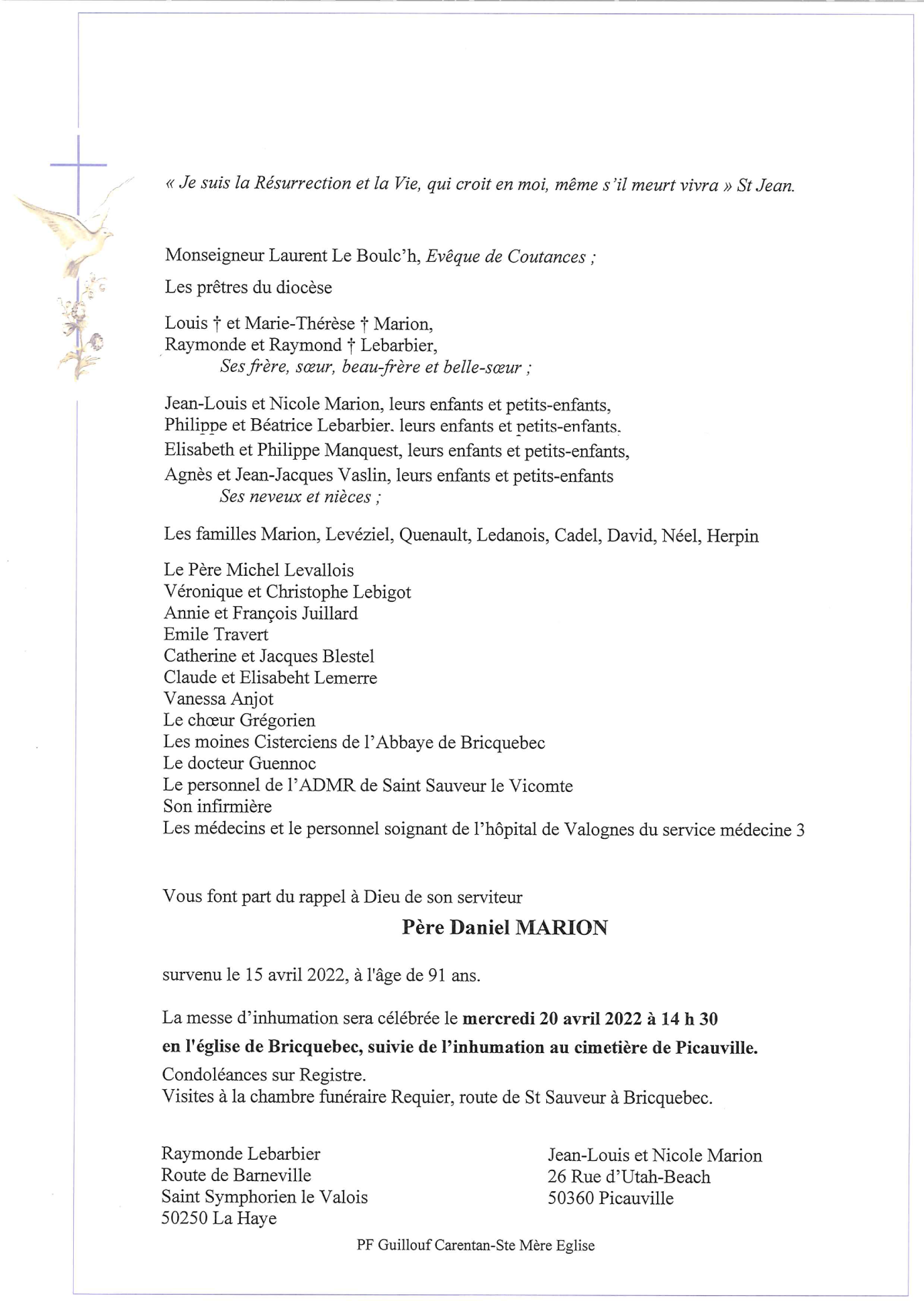 Décédé à Valognes (50700, France) le vendredi 15 avril 2022 à l'âge de 91 ans