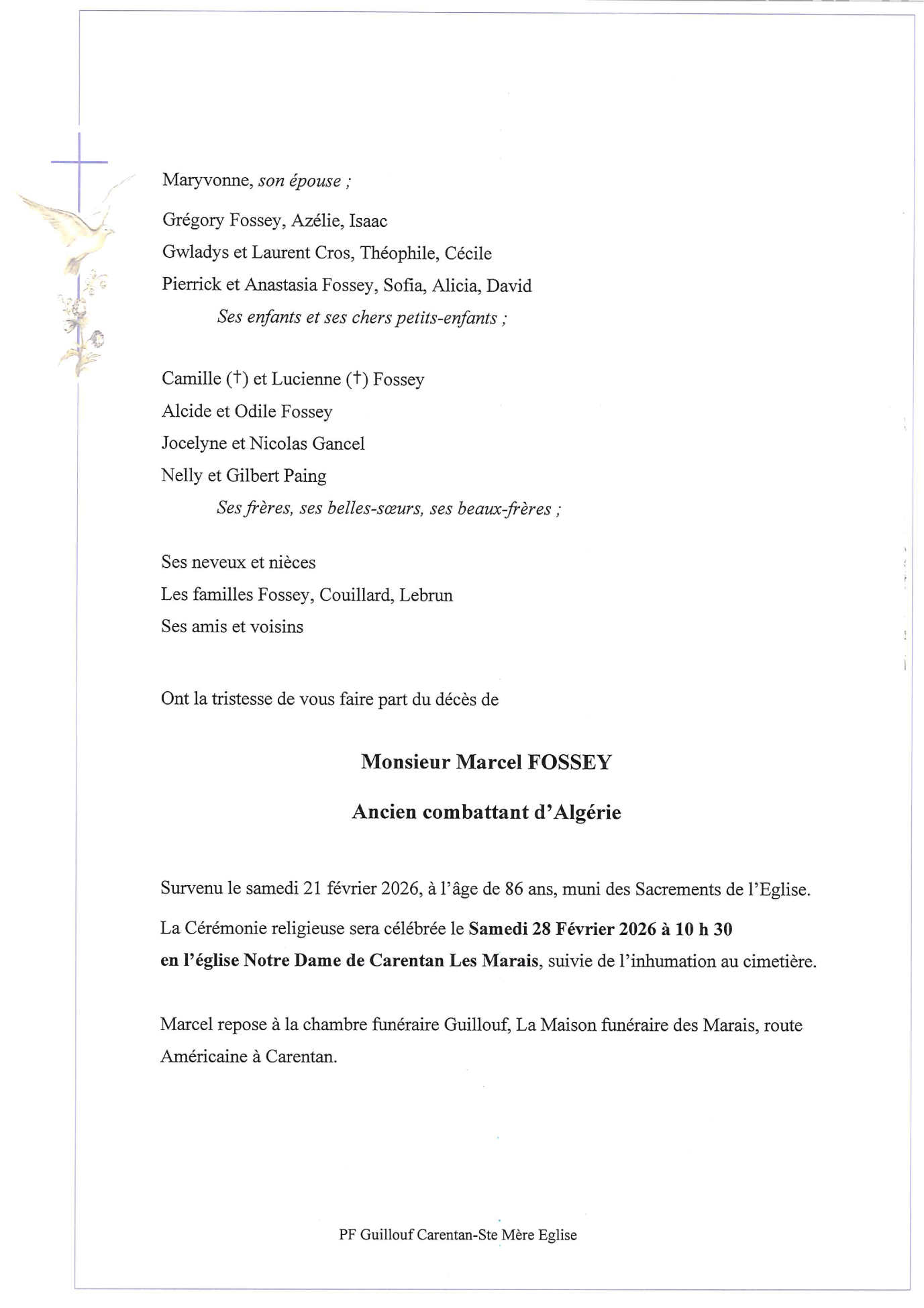 Décédé à Saint-Lô (50000, France) le samedi 21 février 2026 à l'âge de 86 ans