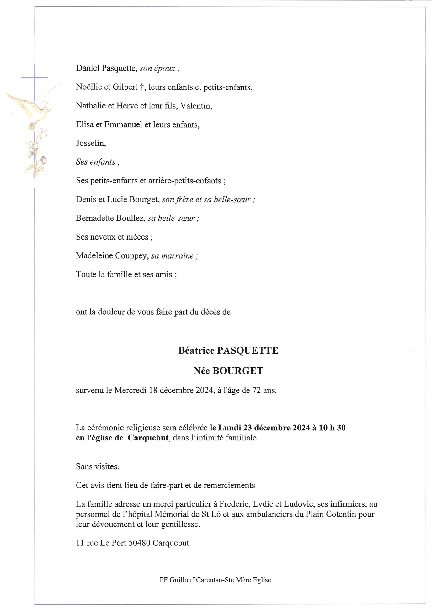 Décédée à Saint-Lô (50000, France) le mercredi 18 décembre 2024 à l'âge de 72 ans