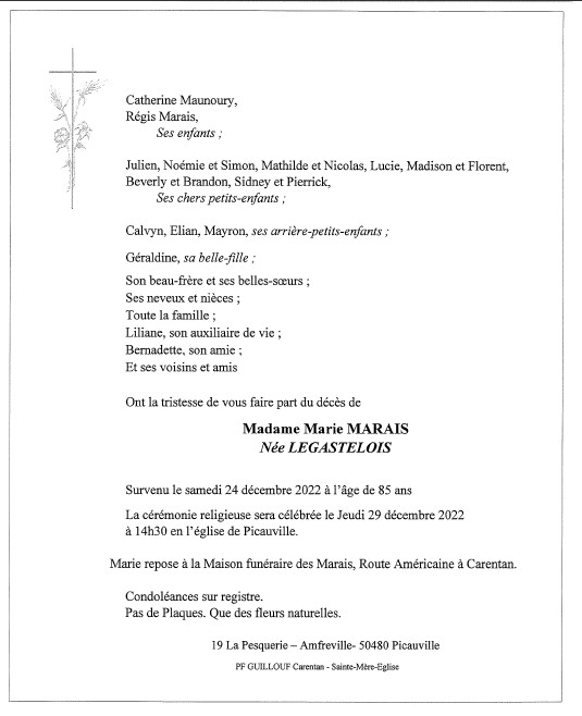 Décédée à Sainte-Mère-Eglise (50480, France) le samedi 24 décembre 2022 à l'âge de 85 ans